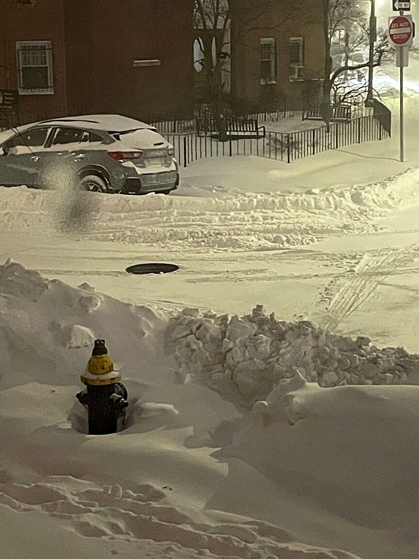 Intersection Of Symphony Rd And Saint Stephen St, Boston, MaSnow plow blocking fire hydrant with show from street / hazzard