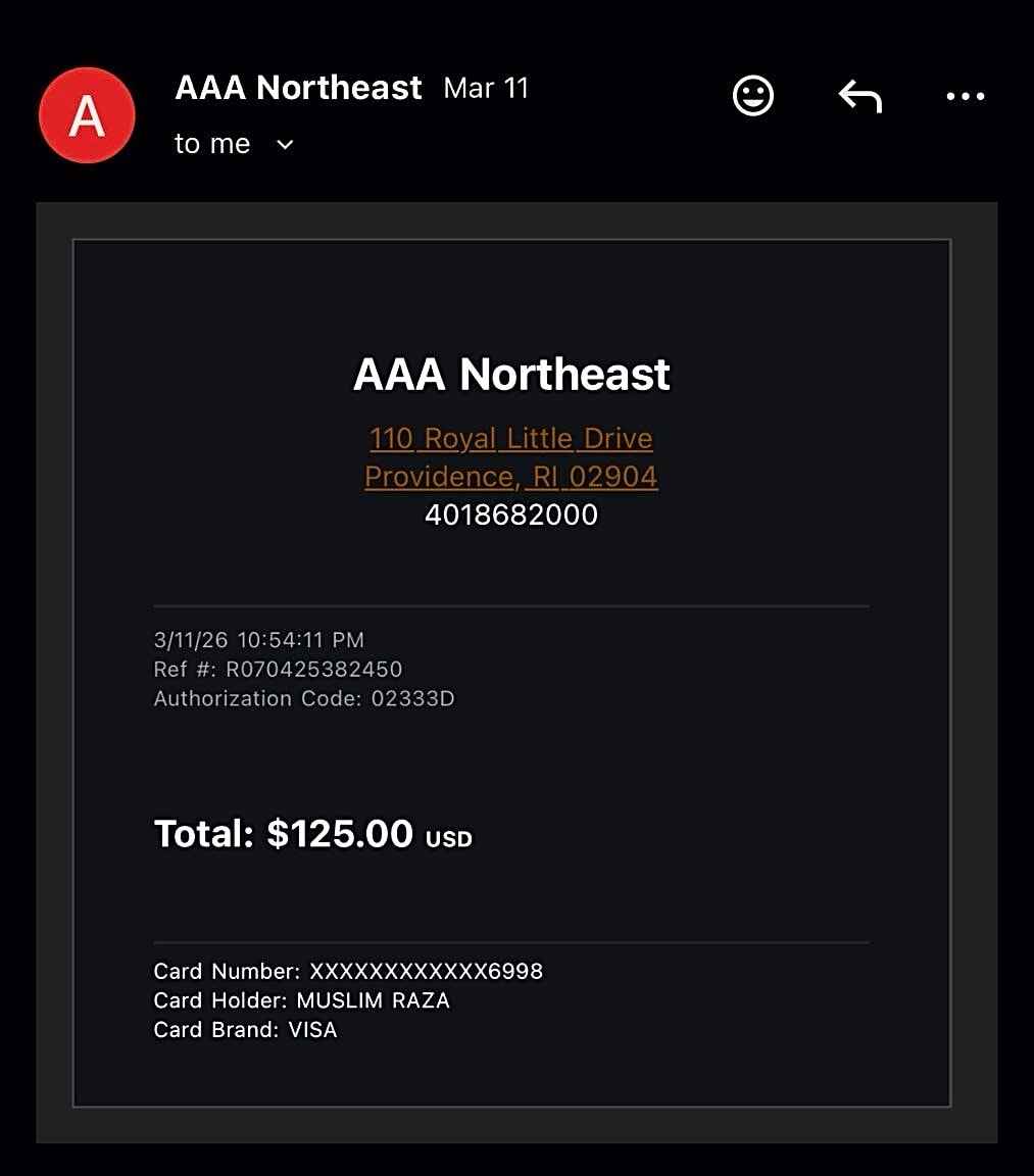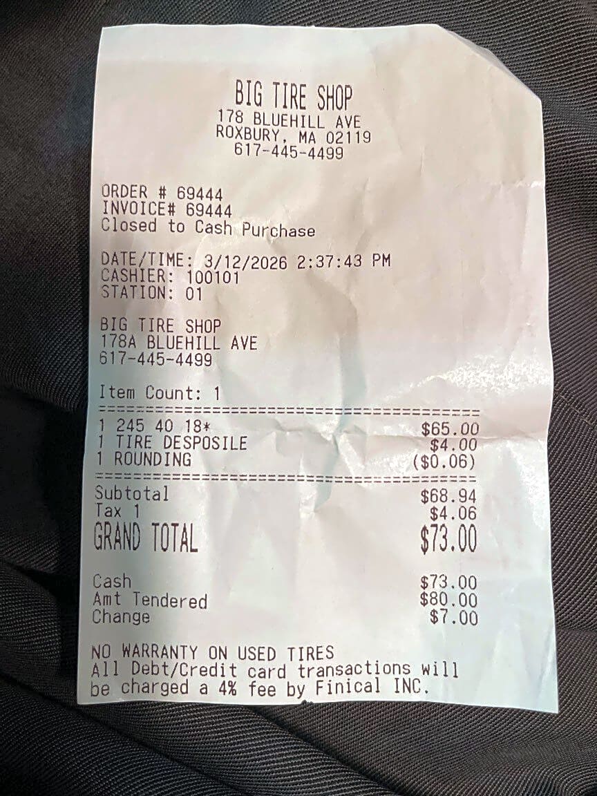 610 Albany St, Roxbury, Ma, 02118Road Incident Description On March 11, 2026, at approximately 10:00 PM, I was driving to complete food delivery orders for Grubhub. While traveling on Massachusetts Ave Connector Boston, MA 02118, my vehicle struck a large pothole in the roadway. The impact caused significant damage to the right passenger-side tire, resulting in a puncture that made the vehicle unsafe to drive. Due to the damage, I contacted AAA roadside assistance for emergency support. The service cost $125, and the tire replacement/repair cost $73. As this damage occurred due to hazardous road conditions while I was actively working, I respectfully request reimbursement for the total amount of $198. Thank you for your consideration. Sincerely Muslim Raza