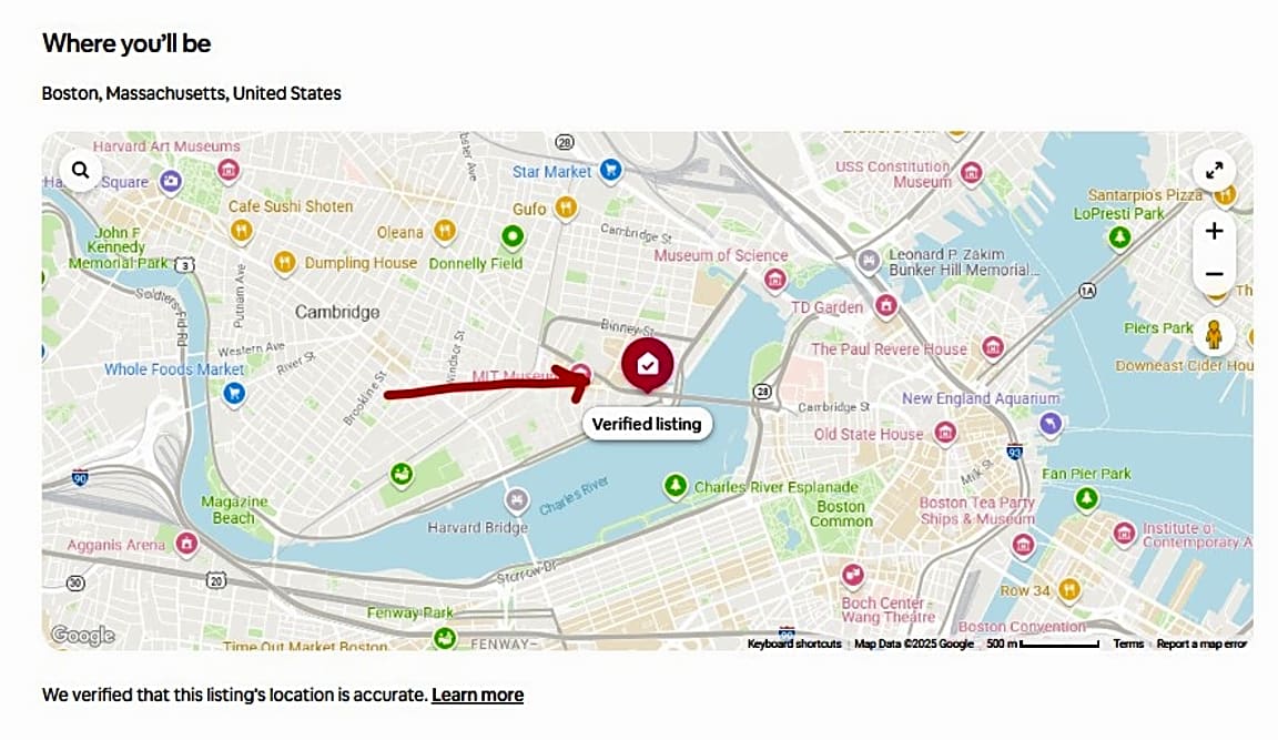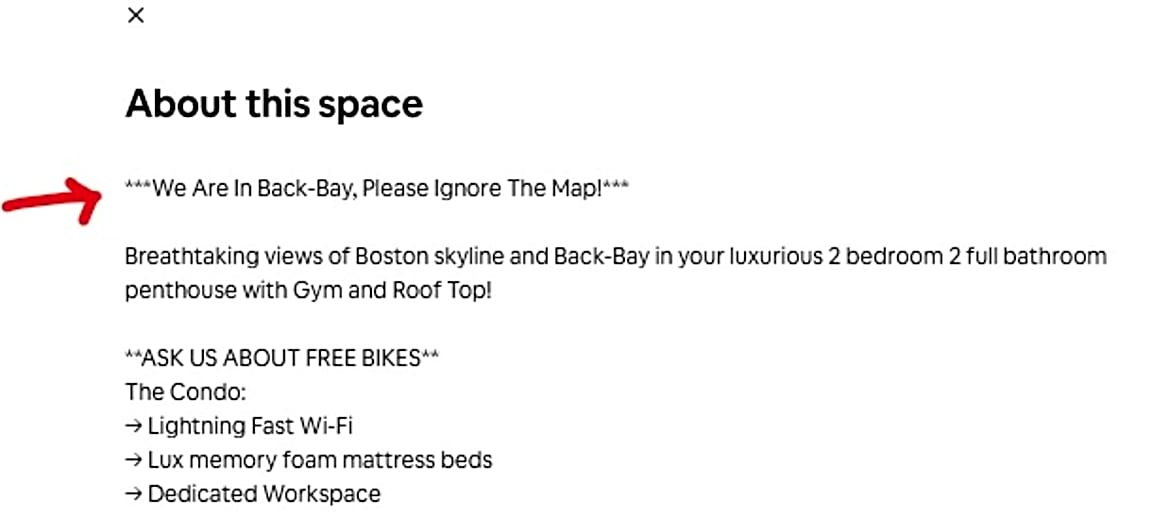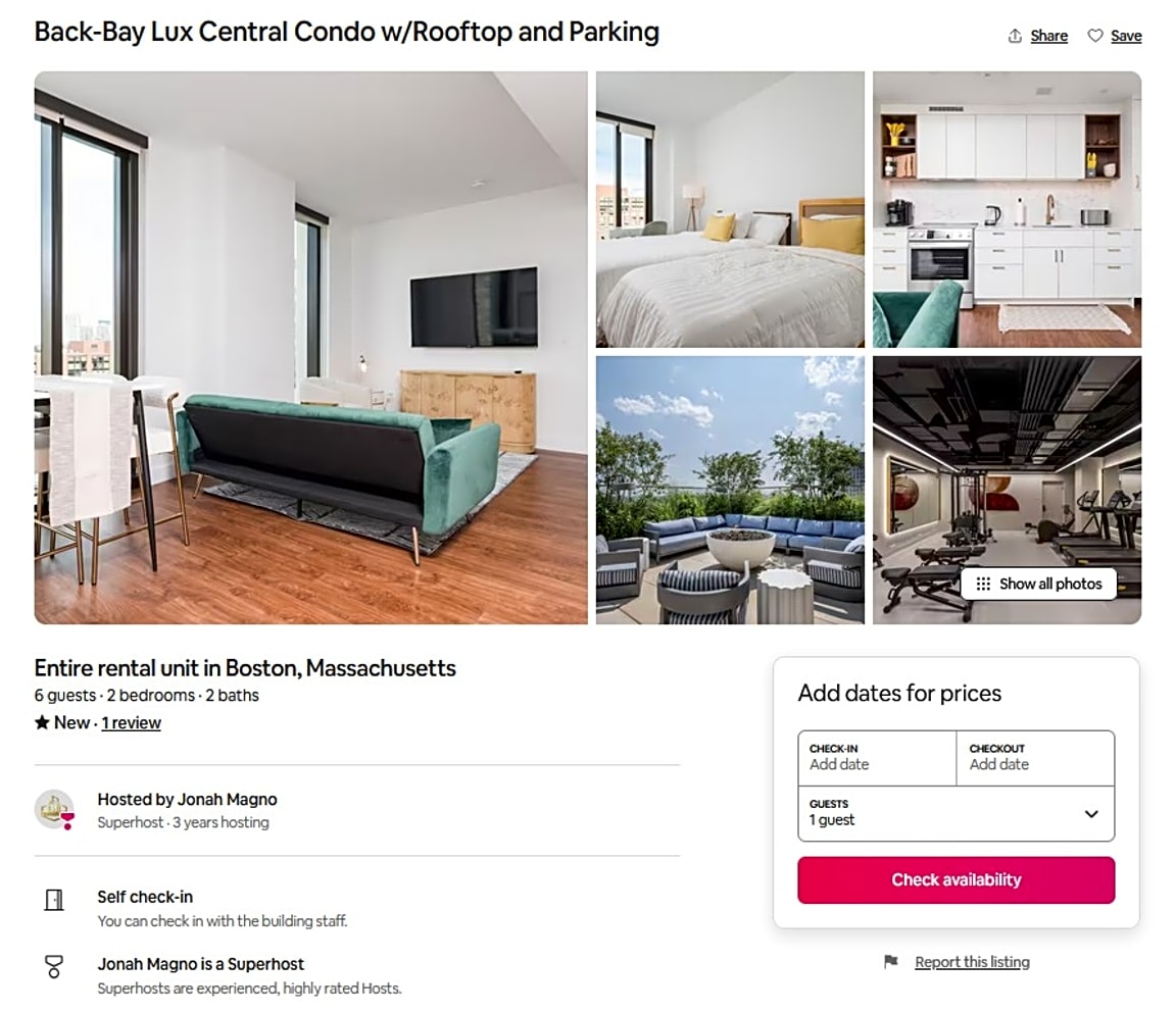 - Please see reports #101006030415, #101006030404, #101005700213, #101005405888, and #101005384897. Hosts Jonha Magno and Humberto of "Mass Living" have had their short term rental listings removed several times as their units are not eligible. They have just become more creative in how they list these illegal short term rentals. They are now using the 'verified listing' status available under Airbnb to list their units as being in Cambridge but then adding a note in the property description "***We Are In Back-Bay, Please Ignore The Map!***" to hide the fact that these listings are located at 212 Stuart St. All listings still state Back-Bay and still advertise Boston area condos. Please check the host profile for full listings but there are also 7 listings using this Boston/Cambridge trick below. Can we please take meaningful enforcement action on this host and building owner since they clearly have no respect for legally approved Boston regulations put in place to protect our community? - Host: https://www.airbnb.com/users/show/463475392 - Listing 1 - https://www.airbnb.com/rooms/1268272053109308382?source_impression_id=p3_1745330983_P3UrRkVo2-8MsXVa - Listing 2 - https://www.airbnb.com/rooms/1093756346559375157?source_impression_id=p3_1745330983_P3Q0VoIQJQJrSwjr&check_in=2025-04-22&guests=1&adults=1 - Listing 3 - https://www.airbnb.com/rooms/1359013623672760636?source_impression_id=p3_1745330983_P3Ye1oGTMkzLfruM - Listing 4 - https://www.airbnb.com/rooms/1268486506424486225?source_impression_id=p3_1745330983_P3lwqyEEHkszl-Ew - Listing 5 - https://www.airbnb.com/rooms/1351527141697304081?source_impression_id=p3_1745331025_P3nNKSF5zH98XT4S - Listing 6 - https://www.airbnb.com/rooms/947111916947155717?source_impression_id=p3_1745331025_P3RhgHbL-uuMDa5t - Listing 7 - https://www.airbnb.com/rooms/1351527141697304081?source_impression_id=p3_1745330761_P39CeFDQ4biasmHV