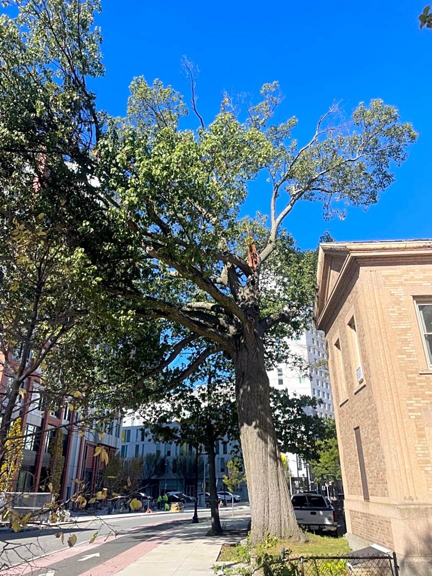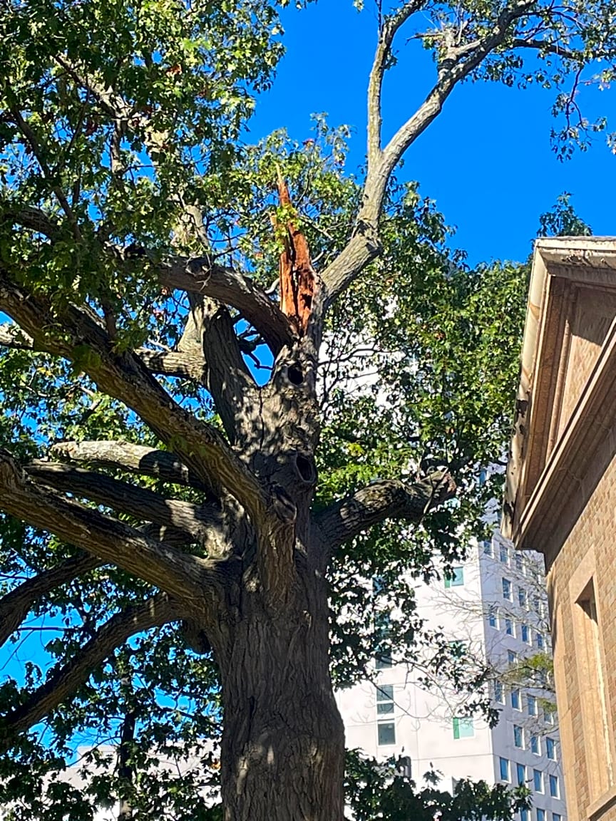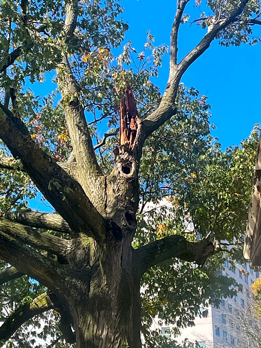 - Large leader from a private oak tree snapped off and is hanging over the sidewalk and needs to be removed for public safety