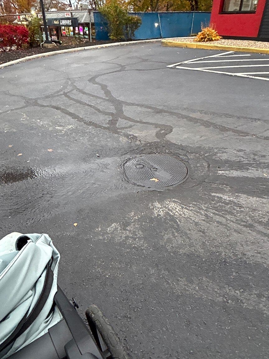 - This man hole is spewing a lot of water and has been leaking for a while. | Where exactly on the pavement is the pothole: [On Roadway] What is the approximate size of the pothole: [See picture on Images tab]