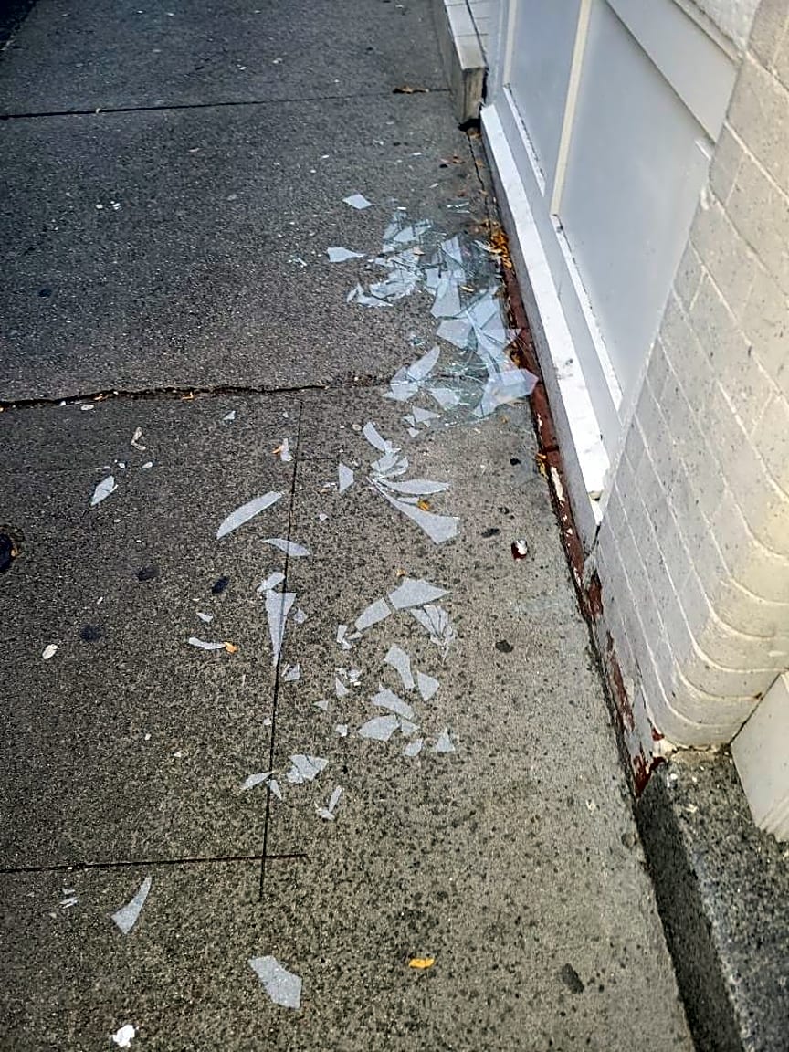 Broken glass all over the sidewalk, between 26-28 Prince St