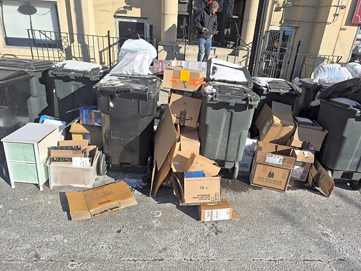 Trash is out to early this is tomorrow and mix with commercial boxes please send to code enforcement. Thank you 12 /15/25