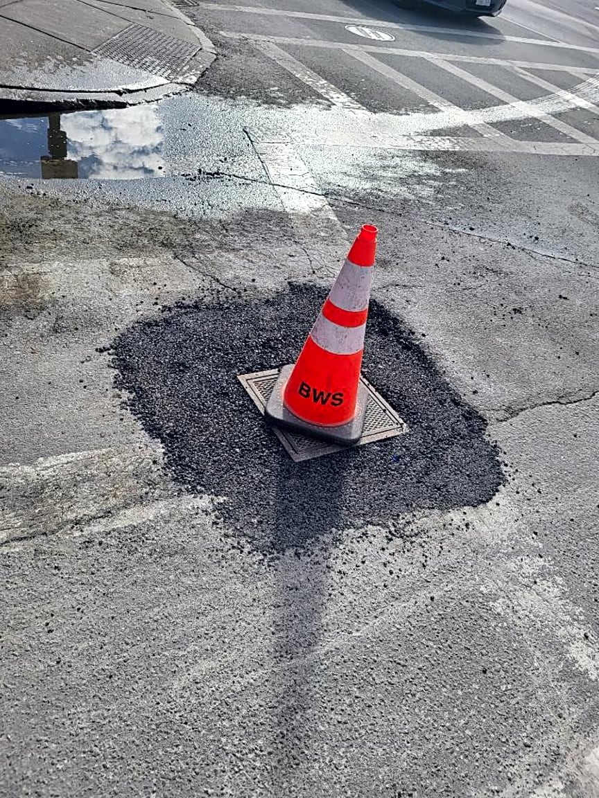 - Constituent reports very large pothole, states it popped residents tire. Stating it is right infront of B2 Police station. | Where exactly on the pavement is the pothole: [On Roadway] What is the approximate size of the pothole: [large] Time when pothole noticed: [08:57]