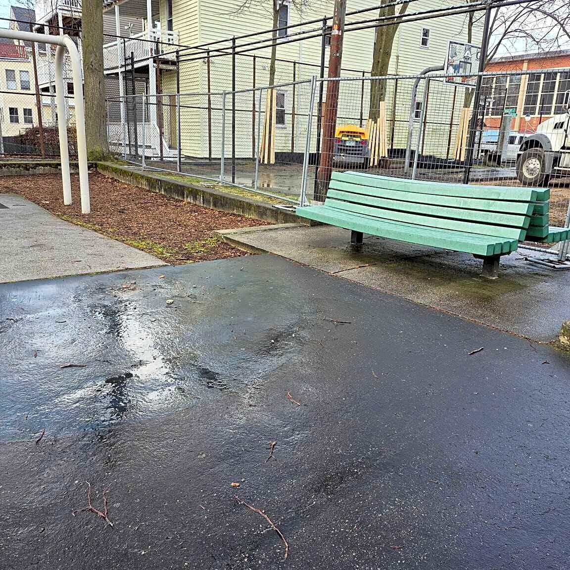 - Debris from the basketball court resurfacing at mozart Park presents a hazard for young children near the swings