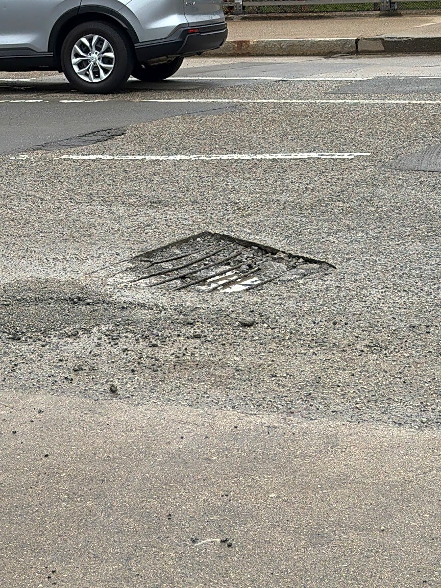 Intersection Of Berkeley St And Massachusetts Tpke W, Boston, MaLarge pothole on overpass on Berkeley over the Mass Pike with exposed rebar