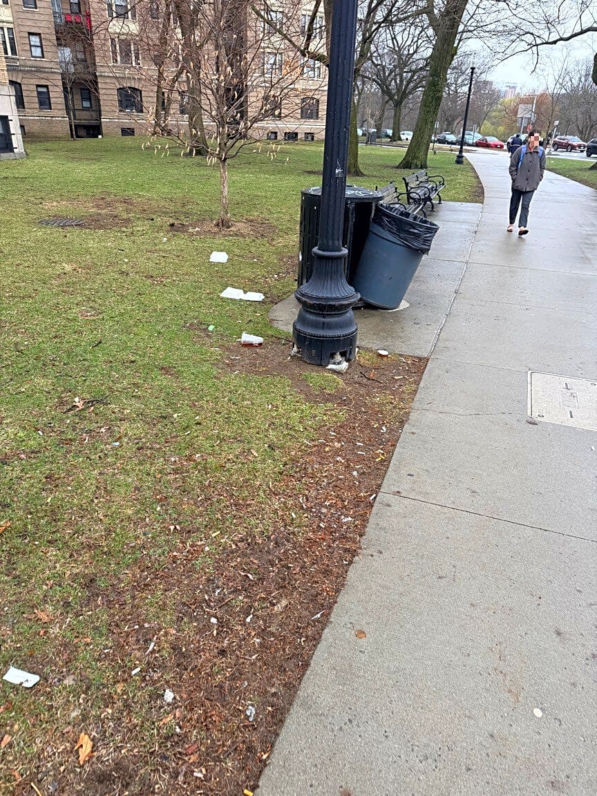 Intersection Of Fenwick Pl And Circuit St, Roxbury, MaLots of trash by trash can
