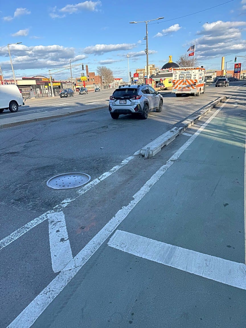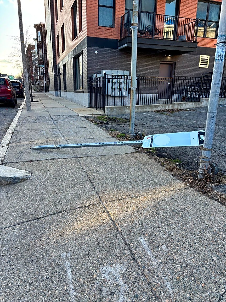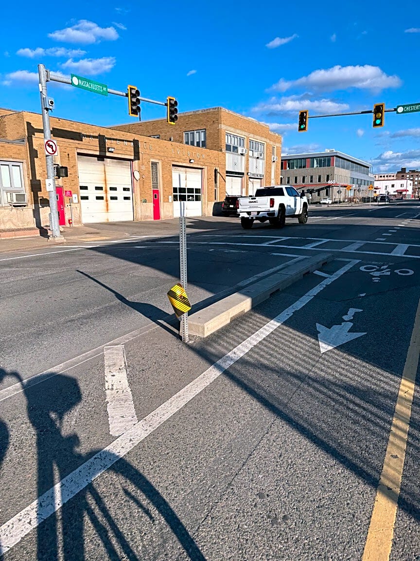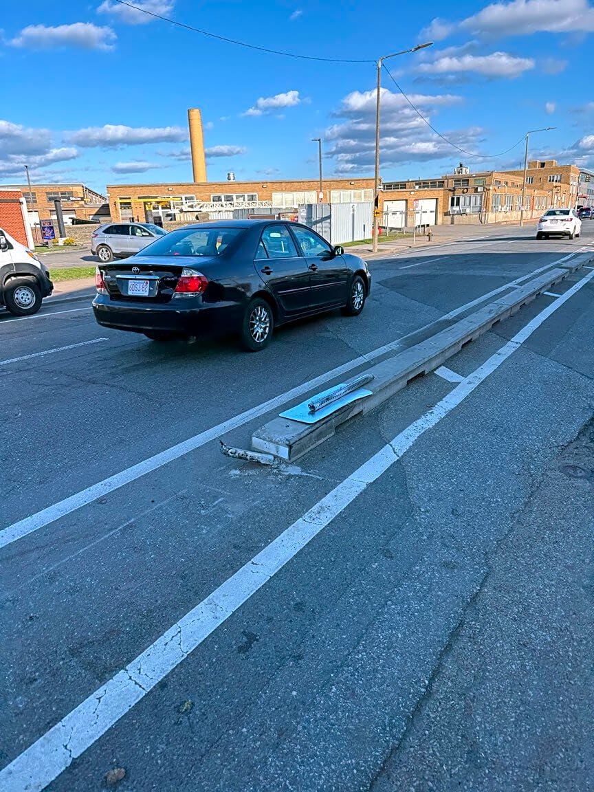 Intersection Of Massachusetts Ave And Melnea Cass Blvd, Roxbury, MaReflector sign predictable hit following white post removal. Watched 2 cars veer around this chaotically just now. Removing the white posts was pretty reckless.