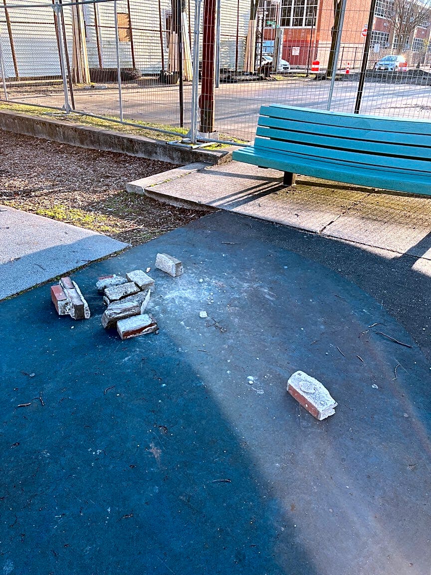 10 Mozart St, Boston, MA 02130Debris from the basketball court resurfacing at mozart Park presents a hazard for young children near the swings