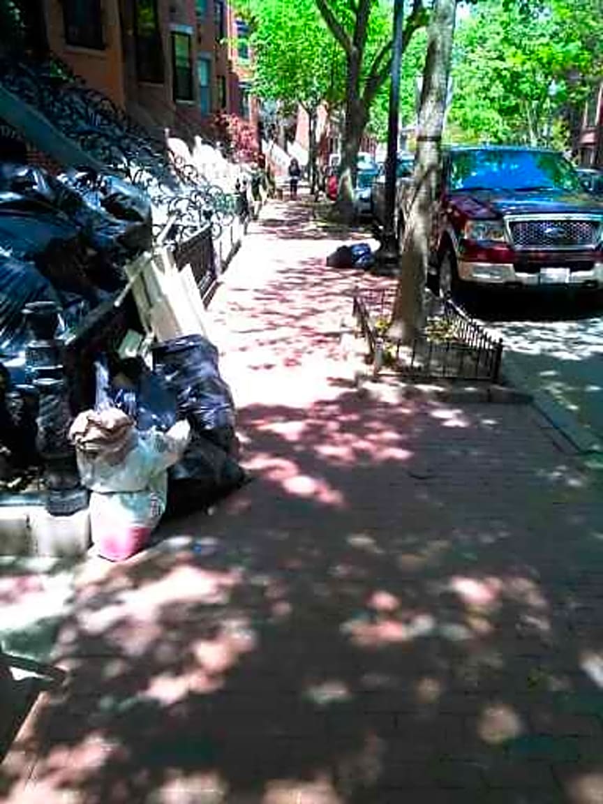 114 Pembroke St, Roxbury, Ma, 02118People can not walk by. It is very dangerous | Construction debris: [Plywood, Sheetrock, buckets of stuff, and bags] Exact location: [sidewalk]