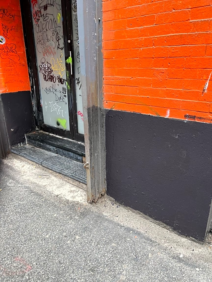 CLOSED #101006627083Resolved. Graffiti removed owner is going to replace the door and paint the building back orange.