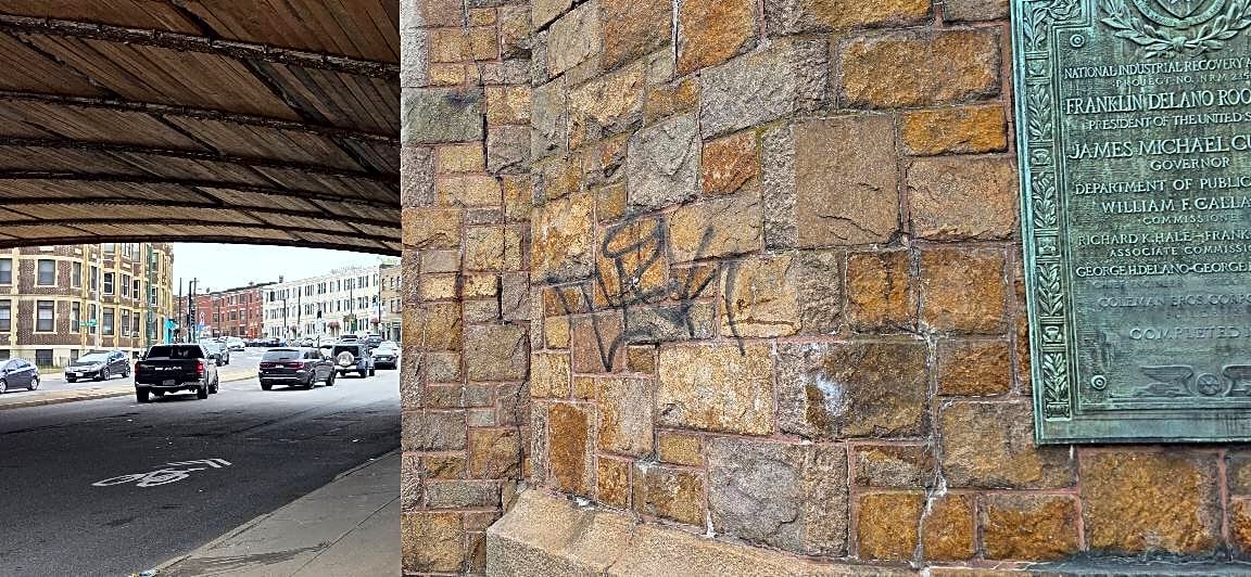 Intersection Of Riverway And Jamaicaway And Huntington Ave, Jamaica Plain, MaGraffiti all over bridge