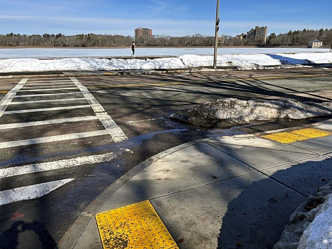 2450 Beacon St, Brighton, Ma, 02135Cross walk need moving and relining in Spring, new handicap pads were added last fall. In new locations and no longer matching cross walk lines. I have attached two photographs. Location is 2400 blocks on Beacon Street. Across from Chestnut Hill Reservoir