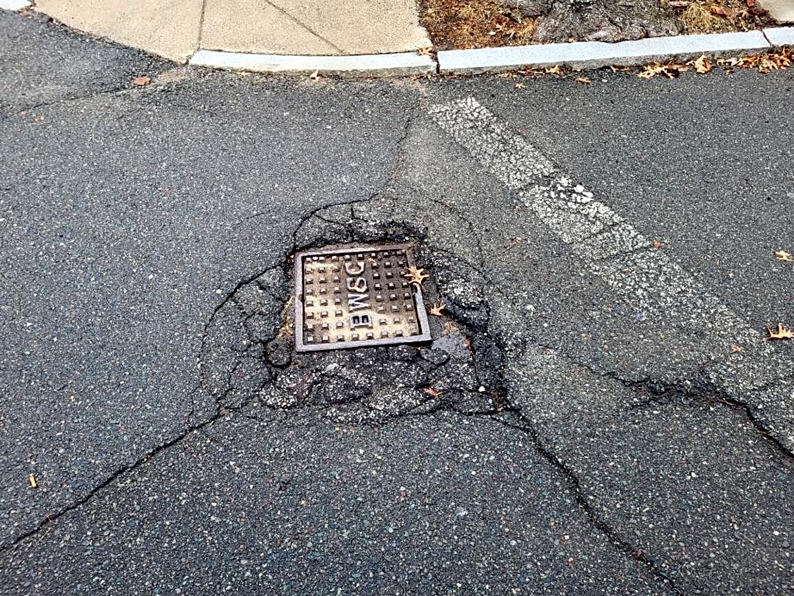 97 Whitford St, Roslindale, Ma, 02131Large pothole around manhole cover belonging to bwsc